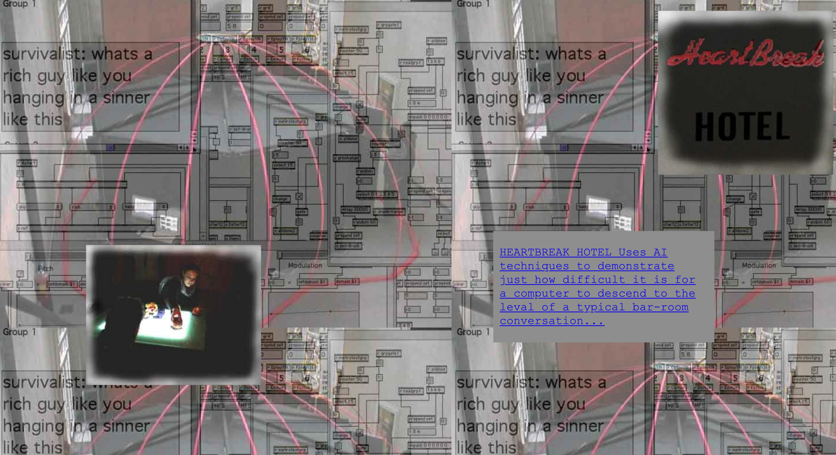 The project issues, not only from a collaboration between two artists (much of which takes place at over the internet) but also from a sum of residencies and collaborations with different partners: The GMEM (Centre nationale de creation musicale Marseille, France), the GMEM are not only co-producing this project financially but also helping in terms of programming and development. The Data base system “Gnoum” was written in LISP by Laurent Pottier, working in collaboration with Peter Sinclair during a residency which took place in June this year. Laurent has also helped by adapting the Holospat to this project. GMEM will present the piece in Marseille, France Jan 01. The CICV Pierre Schaeffer; Invited G.H. Hovagimyan and Peter Sinclair to do a one month residency (August/September) during which they were able to concentrate on experimentation with different methods of text generation. STEIM, Invited Peter Sinclair on a residency at there studios in Amsterdam. This residency was used to develop the Bigeye interface with expert guidance from Frank Balde (in house developer). At the time of writing we are about to embark on the construction of the physical environment which houses this piece, the complex question of sound-proofing, coupled with transportability, as well as the aesthetics of the structure have been worked out with the help of Architect Tilman Reichert, and the marseille based company specializing in acoustics Iso-inso. Extracts showing Hearbreak Hotel presented at STEIM, Amsterdam.